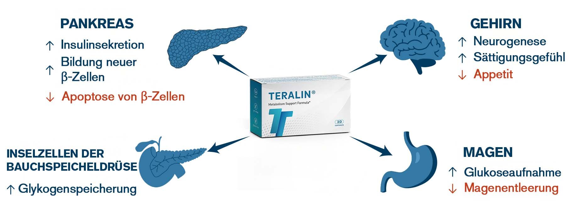 Die Teralin Kapseln gehören zu einer neuen Generation von natürlichen Stoffwechselaktivatoren. Sie unterstützen den Körper dabei, die Nahrungsaufnahme zu reduzieren und den Appetit zu kontrollieren. Zusätzlich ahmt Teralin ein zweites Hormon namens GIP nach, das neben der Appetitkontrolle auch die Verarbeitung von Zucker und den Fettabbau verbessern kann. So bieten die 100% natürlichen Teralin Kapseln einen doppelten Wirkansatz für effektiven Gewichtsverlust.